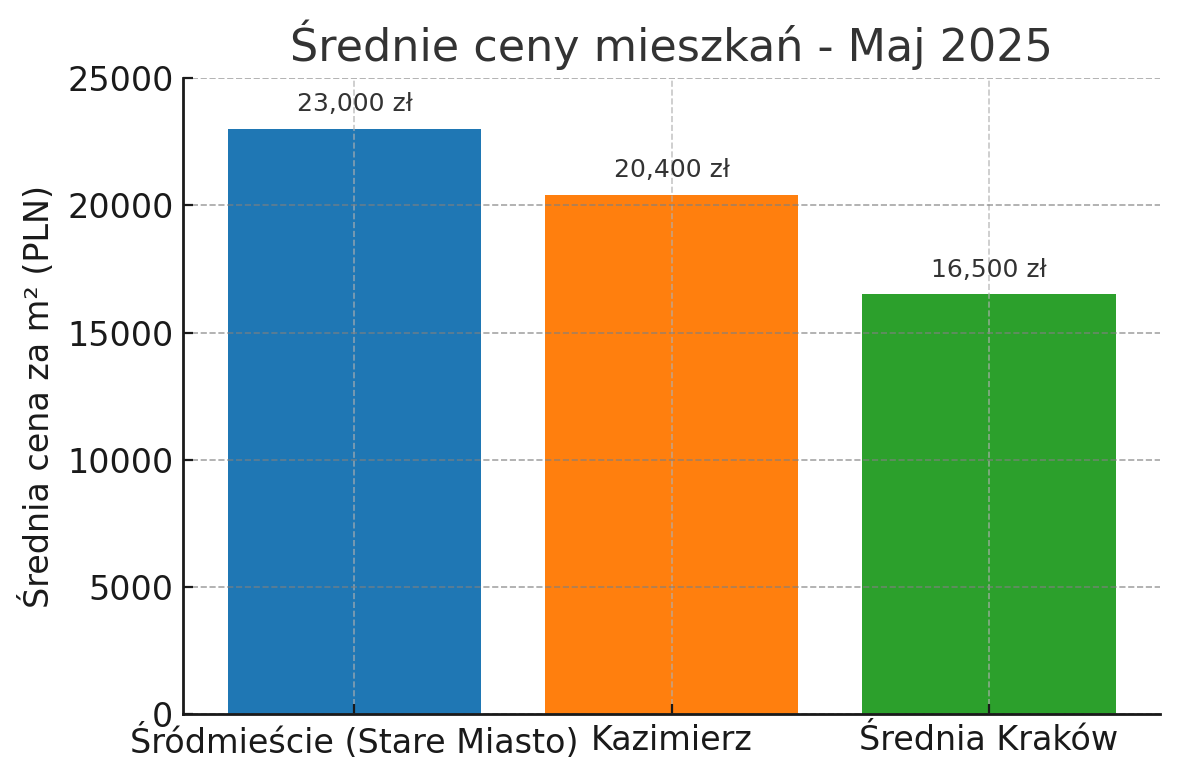 Dla porównania, średnia cena ofertowa mieszkania w Krakowie (wszystkie dzielnice) w maju 2025 r. to około 16,5 tys. zł/m². Widzimy zatem, że Stare Miasto jest wyceniane blisko 40% powyżej średniej miejskiej, a Kazimierz ok. 20–25% powyżej średniej. Odzwierciedla to prestiż lokalizacji centralnych – nieruchomości w zabytkowym centrum i okolicach mają najwyższe stawki ze względu na unikalność miejsca, popyt inwestycyjny oraz atrakcyjność turystyczną.